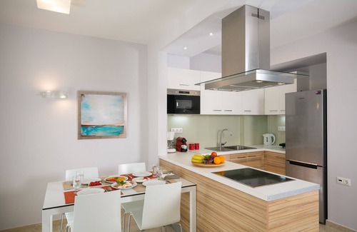 This brand new (2017) luxury maisonette house (Melissa) of 65sqm is a part of the complex Ecovillas in Adele Rethymnon and has a private parking area infront of the house. It has 1 bedroom - with 1 king sized bed - a big sofa and an armchair in the living area (they can be transformed in 2 single beds) , big kitchen and 1 bathroom. The ground floor bathroom has a crystal cabin with rain and waterfalls headshower and a washing machine (in separate area under the indoor staircases who leads to roof terrace).. There is a big ground floor veranda of 25sqm infront of the living area with outdoor dining table and with fantastic pool view. On the other side, in master bedroom area, there is a 15sqm ground floor veranda with private garden. On 1st floor there is a private roof terrace of 55sqm with 2 outdoor sofas and lounge chairs for relax and of course magnificent view .The complex is in a plot of 2000 sq m with a 50sqm shared swimming pool and 1500 of common areas with BBQ and Gardens. Each one of the 5 luxurious residences has fully equipped kitchen with big oven, microwave oven, 4 ceramic hobs for cooking, hood extractor, a family size 2 door refrigerator, a big dishwasher, a nespresso coffee machine, a filter coffee machine, sandwich toaster,α water boiler, dishes, glasses, cups, breakfast bowls, cutlery, utensils and pots for cooking.