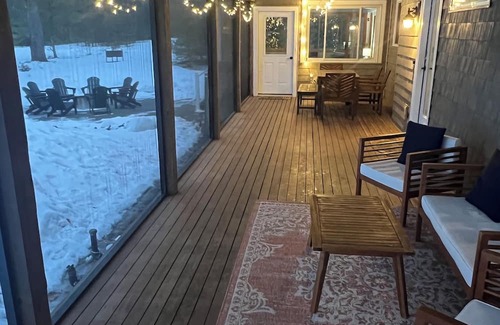Relax in this 3 bedroom, 3 bathroom home with 40 acres to explore! Featuring a gourmet chef's kitchen with a six burner gas range, double oven, warming drawer, two sinks and a dishwasher. The generous dining table seats 10 comfortably. Sit back and enjoy the huge sectional with enough room for everyone and 80" TV. Enjoy a first floor master bedroom with a luxurious king bed, wall mounted tv and electric fireplace. The en suite bathroom features a custom tiled steam shower, soaking tub, and double vanity. Upstairs you'll find a full bathroom, large bedroom with king sized bed, a bunk room with four twins, and a lounge with queen sized couch and huge TV. The large screened in porch is perfect after a long day or work or exploring, and the fire pit with Adirondack chairs keeps the vibes going into the evening. All this so close to North Conway and Fryeburg! Owner occupied basement apartment with separate entrance and driveway.