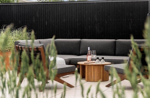 The holiday apartment features a spacious terrace, perfect for relaxing in the fresh air. A modern gas grill invites guests to enjoy outdoor barbecues, while the cozy fire pit offers an ideal setting for evening gatherings under the stars. This outdoor space enhances the overall experience, providing a serene escape for unwinding and enjoying nature.