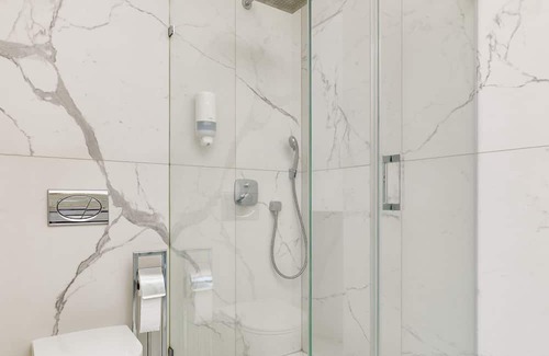 Bathroom with walk-in shower, hairdryer, and premium toiletries