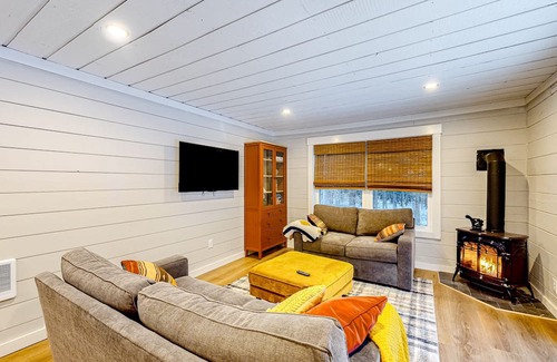 Where the cabin's exterior is classic and rustic, the interior is modern, comfortable, and outfitted with brand-new furnishings. Enjoy a polished kitchen with stainless steel appliances, play board games at the dining room table, and relax by the gas fireplace to stream movies in the evenings.