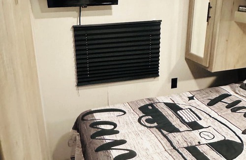 This memorable place is anything but ordinary. Enjoy Glamping in quiet neighborhood with access to WiFi and has AC! Like new, well taken care of family travel trailer. Pet friendly. Modern décor and appliances. Large TV over the electric Fireplace as well as small TV in Bedroom. Updated memory foam queen mattress for the bedroom and updated roll up memory foam mattress for the dinette. Comes with silverware, knives and lot's of cooking utensils (Bowls, cutting boards, etc.) and bedding.