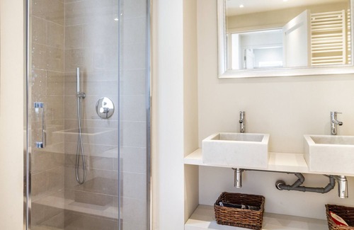 The holiday apartment also boasts an open terrace with a sea view and an outdoor hot tub, a covered terrace, and an outdoor shower.