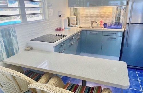 The town-home has 2 levels, both with sea views. The main level has an updated kitchen with quartz countertops, 4 burner cook-top, full size fridge, microwave, toaster oven, blender and much more! The main level balcony is an extension of the living space since it is fully covered and has seating for 4. The main level also has a full bathroom with hot water shower, a trundle bed with 2 twin foam mattresses and a smart TV.