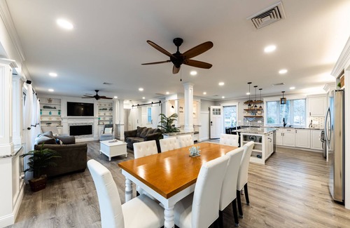 The open floor plan lends itself to a perfect place to relax with friends and family. The fully equipped kitchen has a center island, a breakfast bar and walk in pantry. Plenty of seating in the comfortable dining area that is open to the inviting living room with a flat screen TV located over the fireplace. Off the dining area is a fabulous handmade bar with the most comfortable deck chairs imaginable, to enjoy the view that over looks Follins Pond . Check out the handmade compass set into the Teak & Ivory bar made to feel like your sitting on the back of a boat, Ship-lap and V-Grove panels line the walls throughout