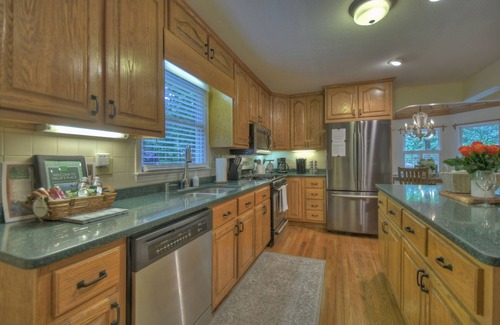 Quiet and tranquil 3 bed/2.5 bath house on Walnut Mountain. At Nellie's Place you'll find the main floor with a nice sized kitchen, beautiful dining room, and spacious living room. The kitchen is fully stocked with most of the kitchen supplies you would need. A Keurig and slow drip coffee are provided. There is a large island with two swivel barstools. In the dining room you will find a round table for 6 surrounded by windows. There is even a baby highchair provided. The living room seats 6 and has a 50 inch Smart TV and gas fireplace. The sunroom allows guests to enjoy the beautiful scenery without having to even go outside. There is also an outdoor deck that provides two shade umbrellas, a picnic table, and seating area to relax and enjoy the fresh air. Use the gas grill to make a delicious meal!