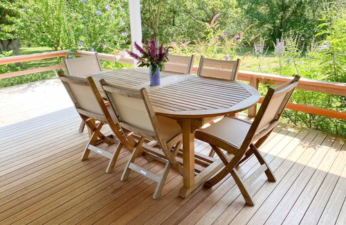 The main house has an air-conditioned, vaulted ceiling central room with "cook's kitchen," open concept living room, and dining room with extendable cherry table. Two walls of floor-to-ceiling glass windows open onto a wraparound deck and an acre of surrounding lawn and gardens. The main house has 4 bedrooms and 2 bathrooms, and hallway windows opening out to the backyard.