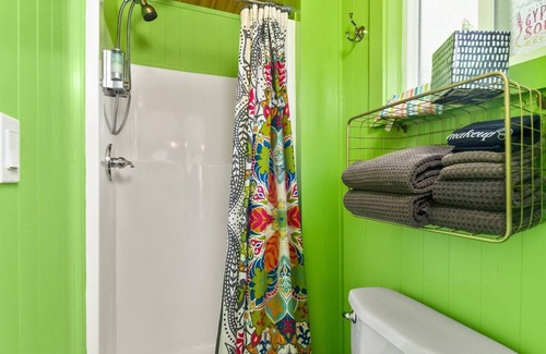 The cedar-lined, curved roof provides a lovely open living area, while the canopied bed chamber is a perfect hide-away for a great night’s sleep. This tiny house is PET-FRIENDLY! **Potty trained, well-behaved dogs are allowed in The Boho for an additional $50 pet fee and $100 pet refundable damage deposit. Please be aware failure to adhere to the house rules as it pertains to pets may result in cancellation of the booking with no refund. There is a 1 pet maximum.