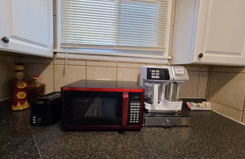 Complimentary amenities for guests include Travel size shampoo, conditioner, lotion, bar soap, wrapped toothbrushes, toothpaste, a roll of paper towels, small dish soap, coffee, decaf K-cups, sweeteners, and powdered creamer.
