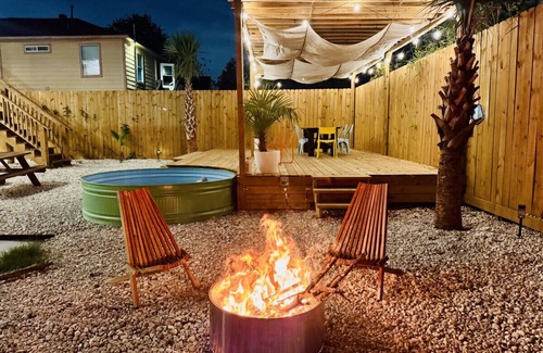 Stylish 2-bedroom, 1-bath apartment with a queen sofa bed, fully equipped kitchen, and a shared backyard featuring a wooden deck, stock tank pool, fire pit, and grill. Located in a quiet neighborhood, minutes from Houston’s top attractions. Sleeps up to 6 guests.