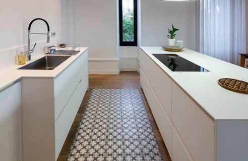A brand new, fully equipped but minimalist kitchen opens up to the dining space to seat 10 and a back kitchen hides away the large American style fridge, quality appliances and storage.
